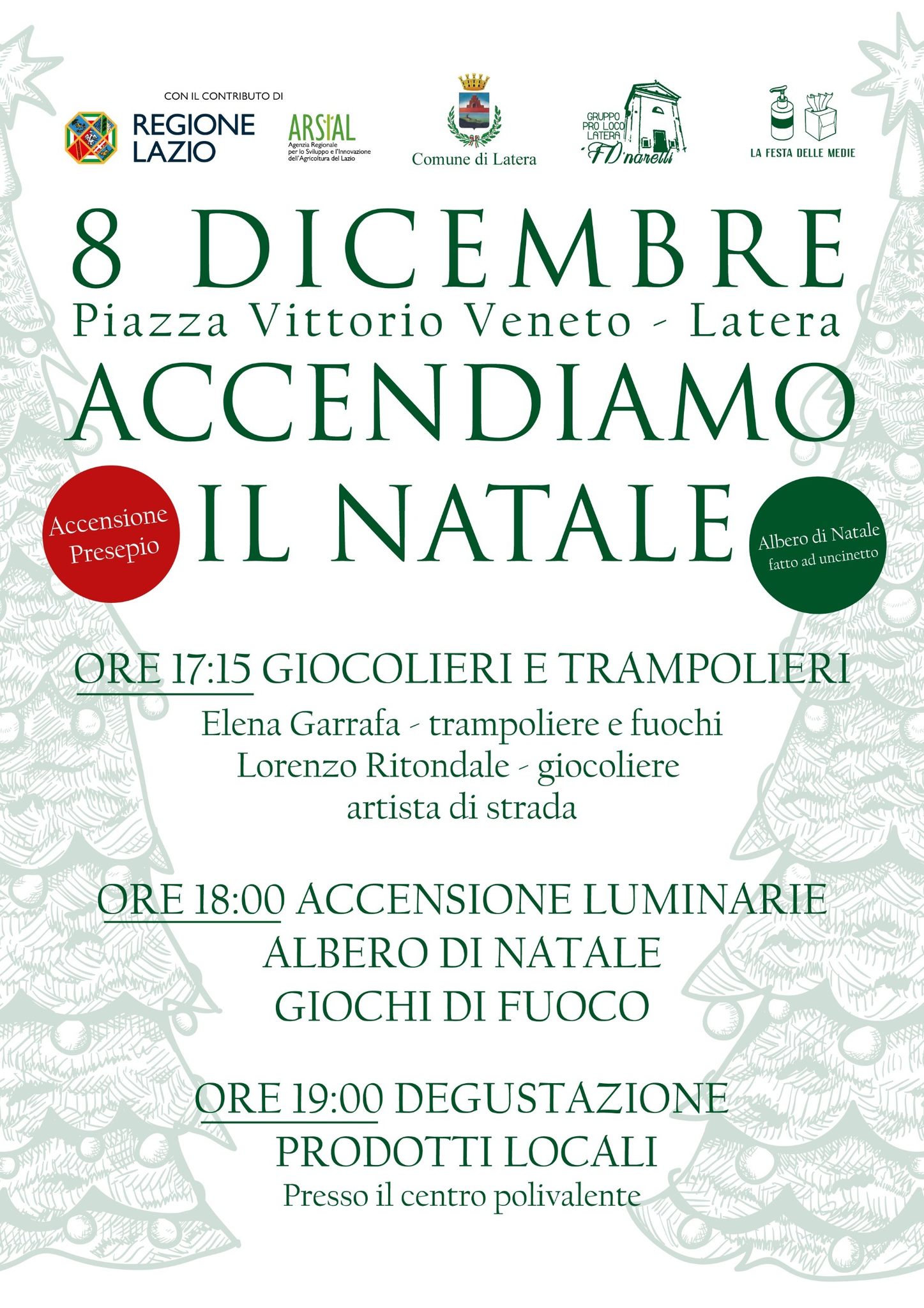 Presso il Centro Polivalente sarà possibile partecipare a una degustazione di prodotti tipici. Nello stesso momento avverrà l’accensione del presepio e dell’albero di Natale realizzato all’uncinetto, espressione della creatività e della tradizione artigianale del territorio.